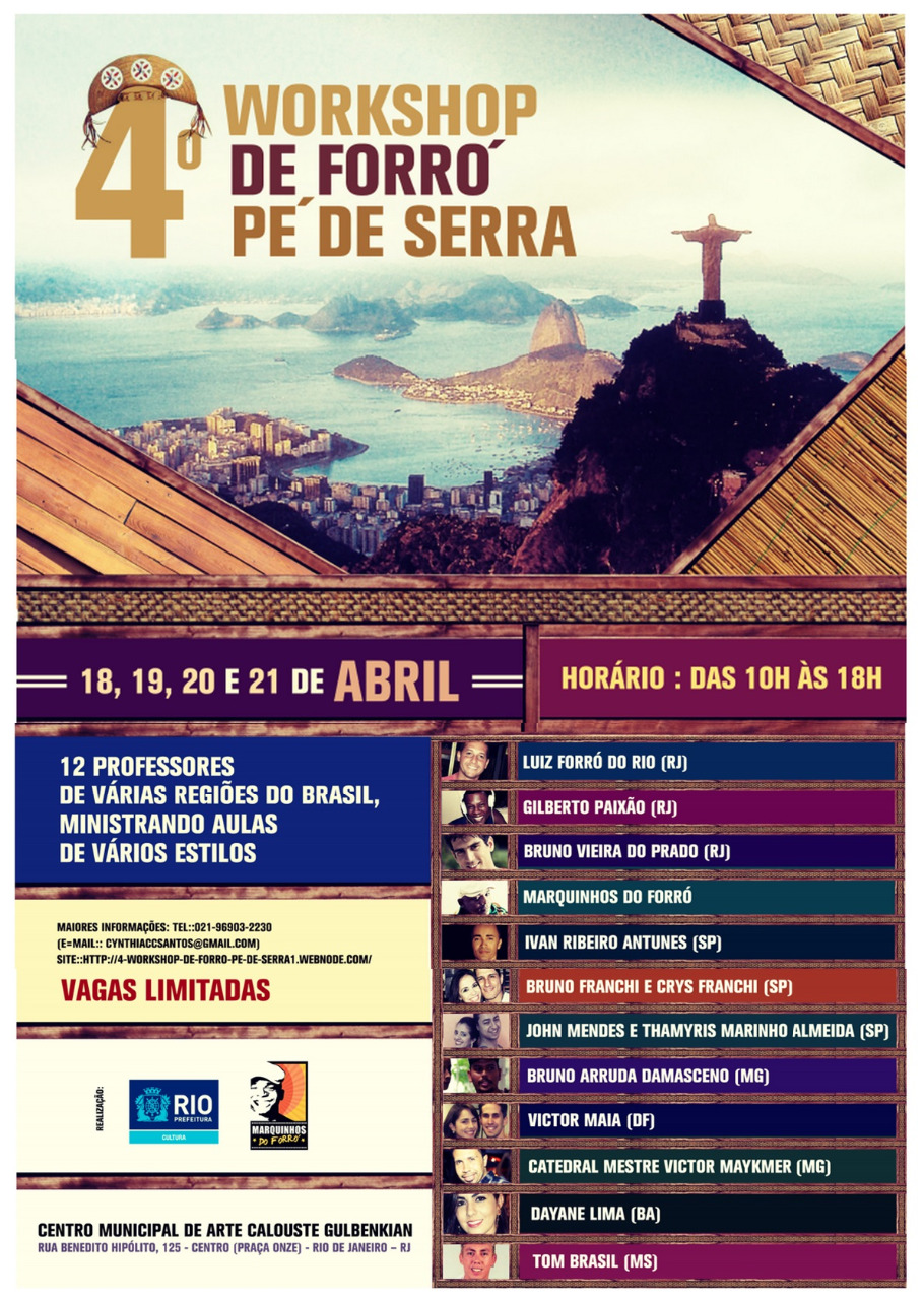 Neste ano estaremos realizando o 4° Workshop de Forró Pé de Serra no Rio de Janeiro, este evento teve inicio em 2011, com o objetivo de reunir profissionais de todos os locais do Brasil ou até mesmo profissionais internacionais que estejam envolvidos com a cultura e divulgação do Forró e da cultura nordestina. Neste ano teremos 12 profissionais envolvidos de diferentes estados do Brasil, queremos ampliar a divulgação desta cultura tão rica e importante para nós Brasileiros para todo o mundo e o principal, não deixar a cultura nordestina ser esquecida.